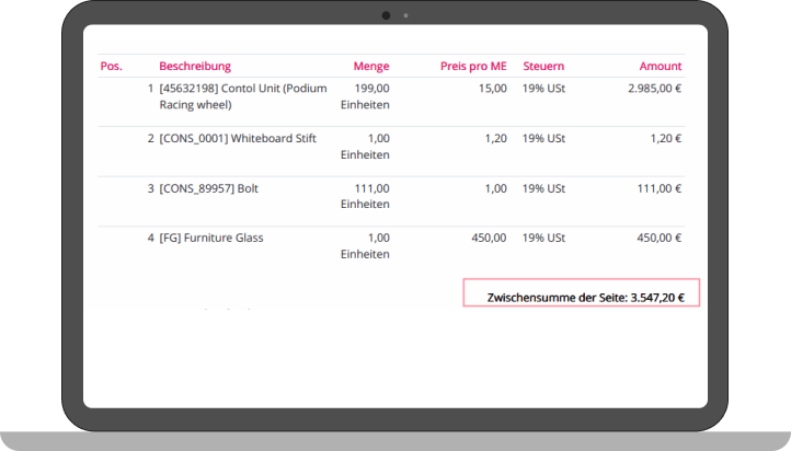 On every page except the last one where the totals are shown anyway, subtotals are shown to gain a better overview of amounts in long reports.