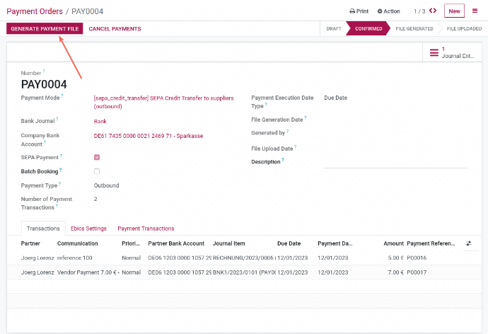 Once you have confirmed the draft, finalize the payment order by clicking on "generate payment file" for transmission to your bank. In this view, you can verify the accuracy of your entered data and perform a final check on the completeness of the invoices included in the payment order.