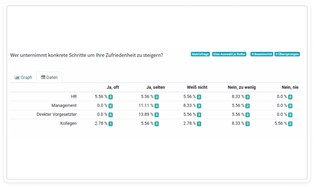 In this case, tabular evaluation displays a matrix question where each provided response option is shown with its exact percentage.
