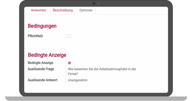 It is common to display certain questions only when a preceding question has been answered with a specific value. This conditional query is illustrated in the screenshot. The question being edited here is only asked when the triggering question, "How do you rate the work atmosphere in the company?" is answered with "Unpleasant."