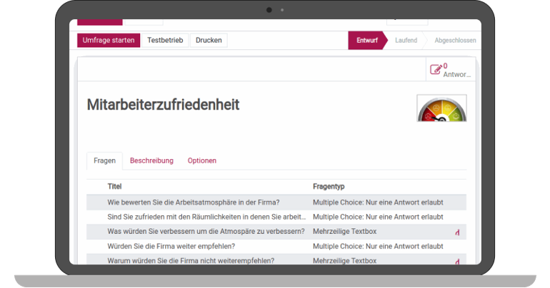 Survey creation begins with the formulation of relevant questions. In this example, we are creating a satisfaction survey aimed at capturing the opinions of employees.